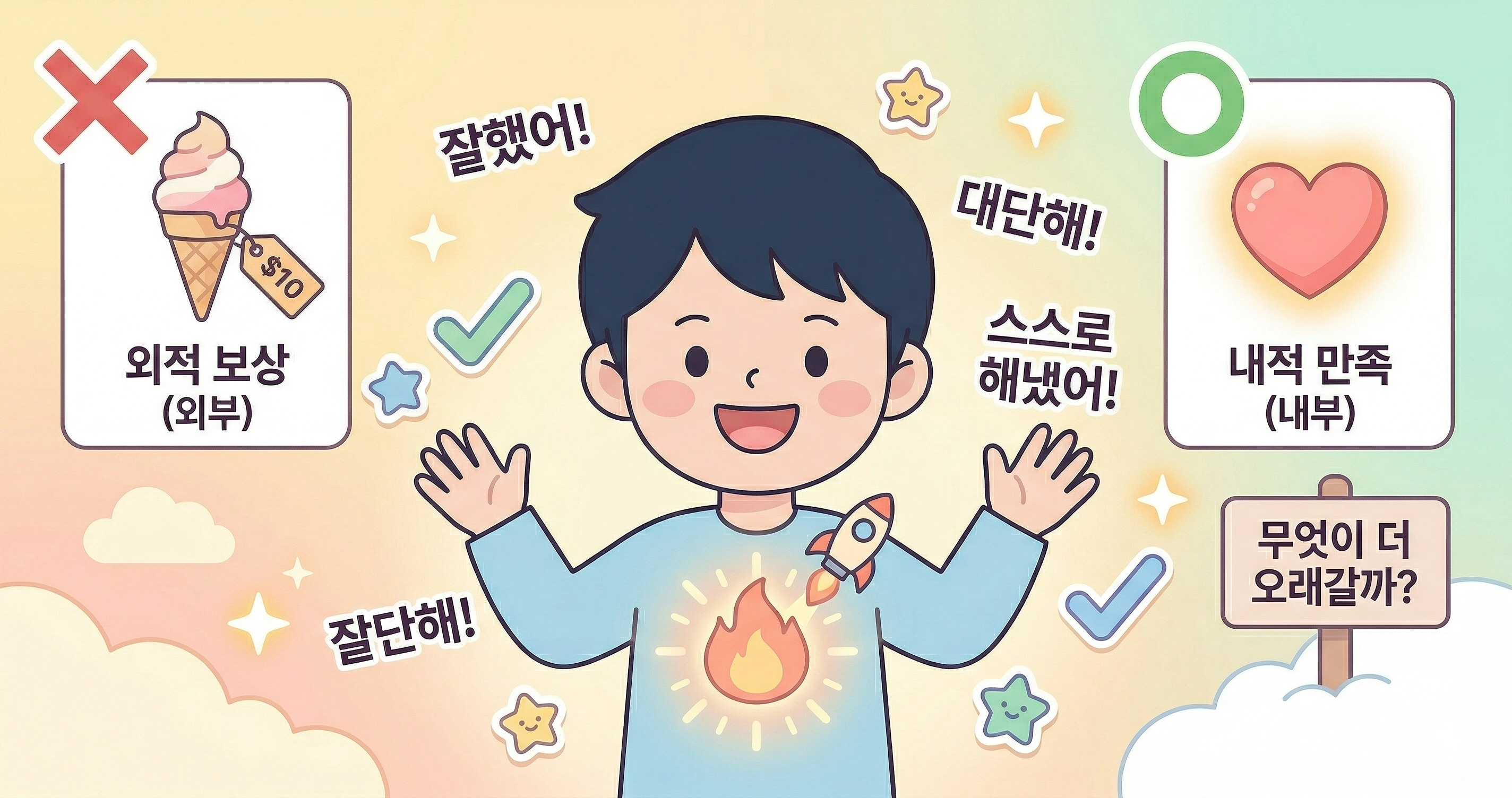 내적 동기는 아이 안에서 나오는 힘이에요. "이거 재미있다", "내가 해냈다!", "더 알고 싶다" 이런 느낌이요. 외적 동기보다 만들기 어렵지만, 한번 생기면 오래가요. 부모가 안 시켜도 스스로 움직이는 원동력이 되는 거죠.